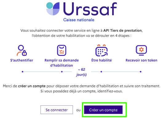 1 - Inscrivez-vous sur la plateforme API Tiers de Prestation de l'Urssaf si vous ne l'avez pas encore fait. L'ouverture d'un compte correspond à "une demande d'habilitation".