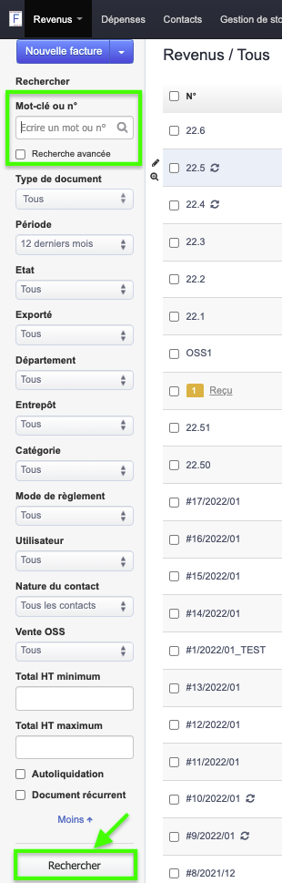 Vous pouvez affiner la liste de vos ventes et dépenses selon vos besoins grâce aux nombreux filtres du module de recherche situé en permanence à gauche de la liste de vos documents de ventes (onglet Revenus) et d'achats (onglet Dépenses). En plus de rechercher un document en particulier, cela vous permet d'effectuer des actions groupées très rapidement, comme relancer les factures impayées ou exporter des écritures comptables.