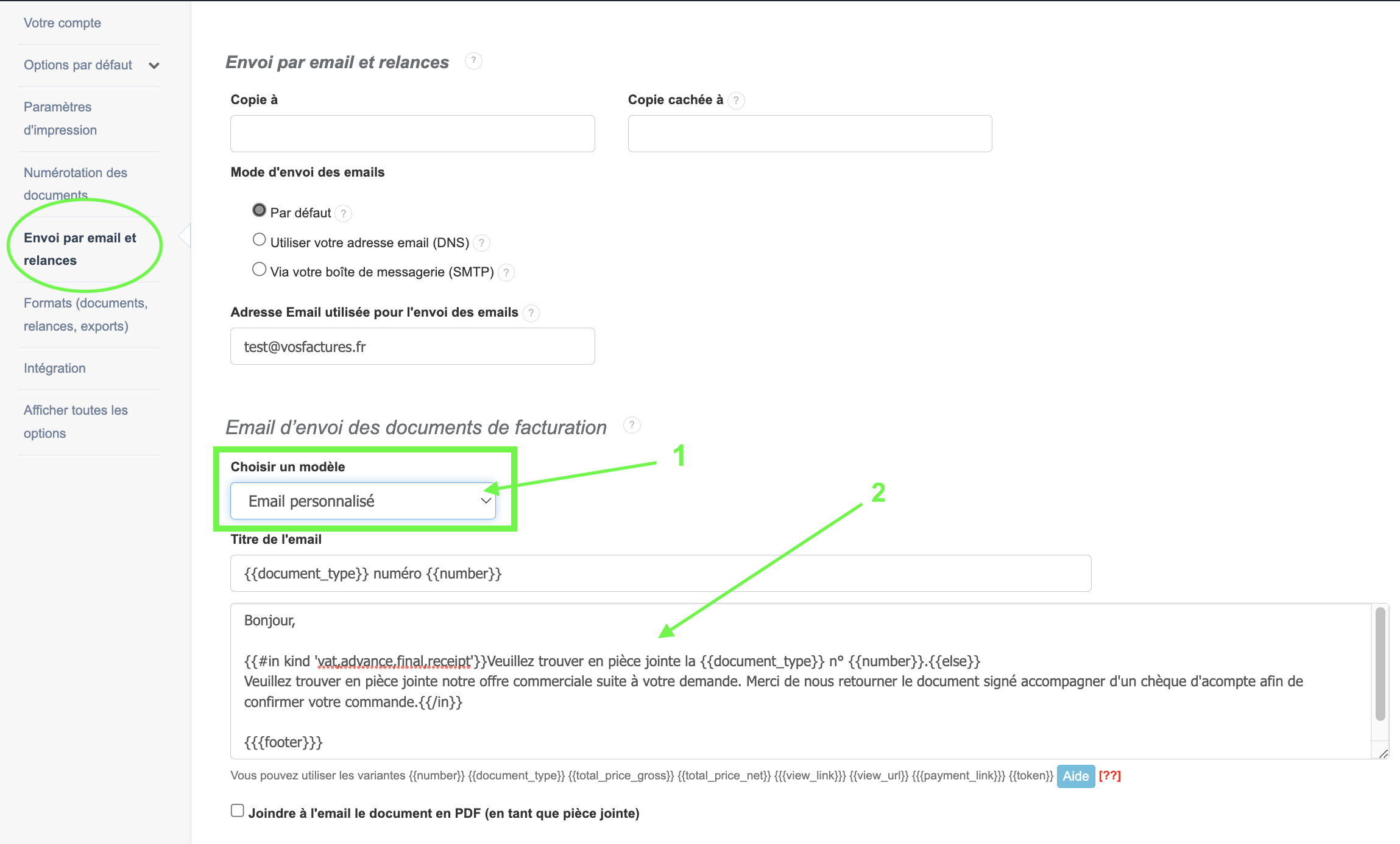 Ci-dessous quelques exemples de personnalisation du texte des emails selon le type de document de facturation envoyé, à renseigner dans le champ prévu à cet effet dans vos paramètres du compte après avoir choisi l'option "Email personnalisé". N'oubliez pas de sauvegarder ensuite.