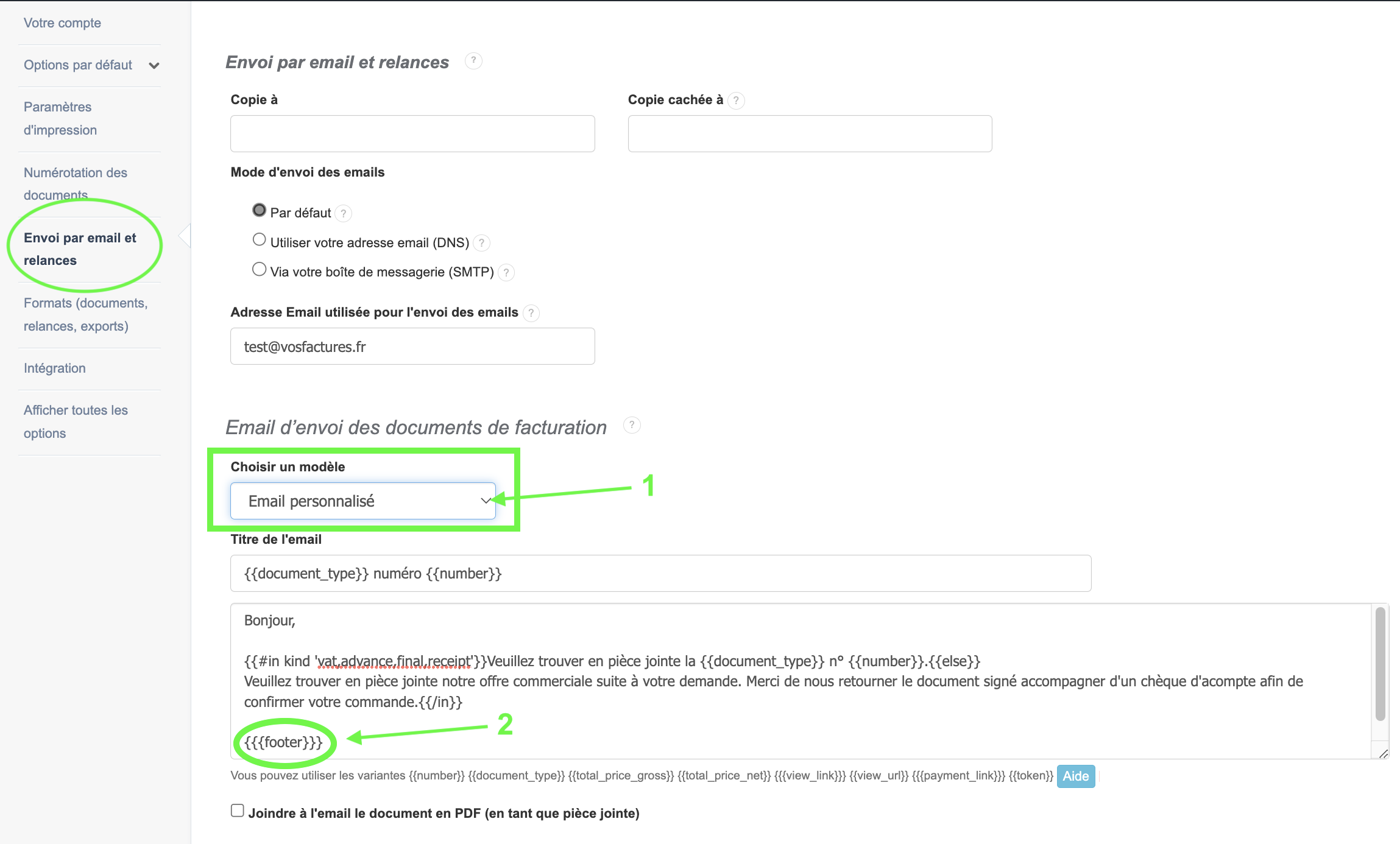 Pour définir une signature des emails différentes selon le type de document envoyé, effacez la variable dynamique {{{footer}}} qui se trouve à la fin du texte par défaut de l'email (accessible depuis Paramètres du compte > Envoi par email > Email personnalisé), et remplacez-la directement par le contenu de la signature souhaitée.