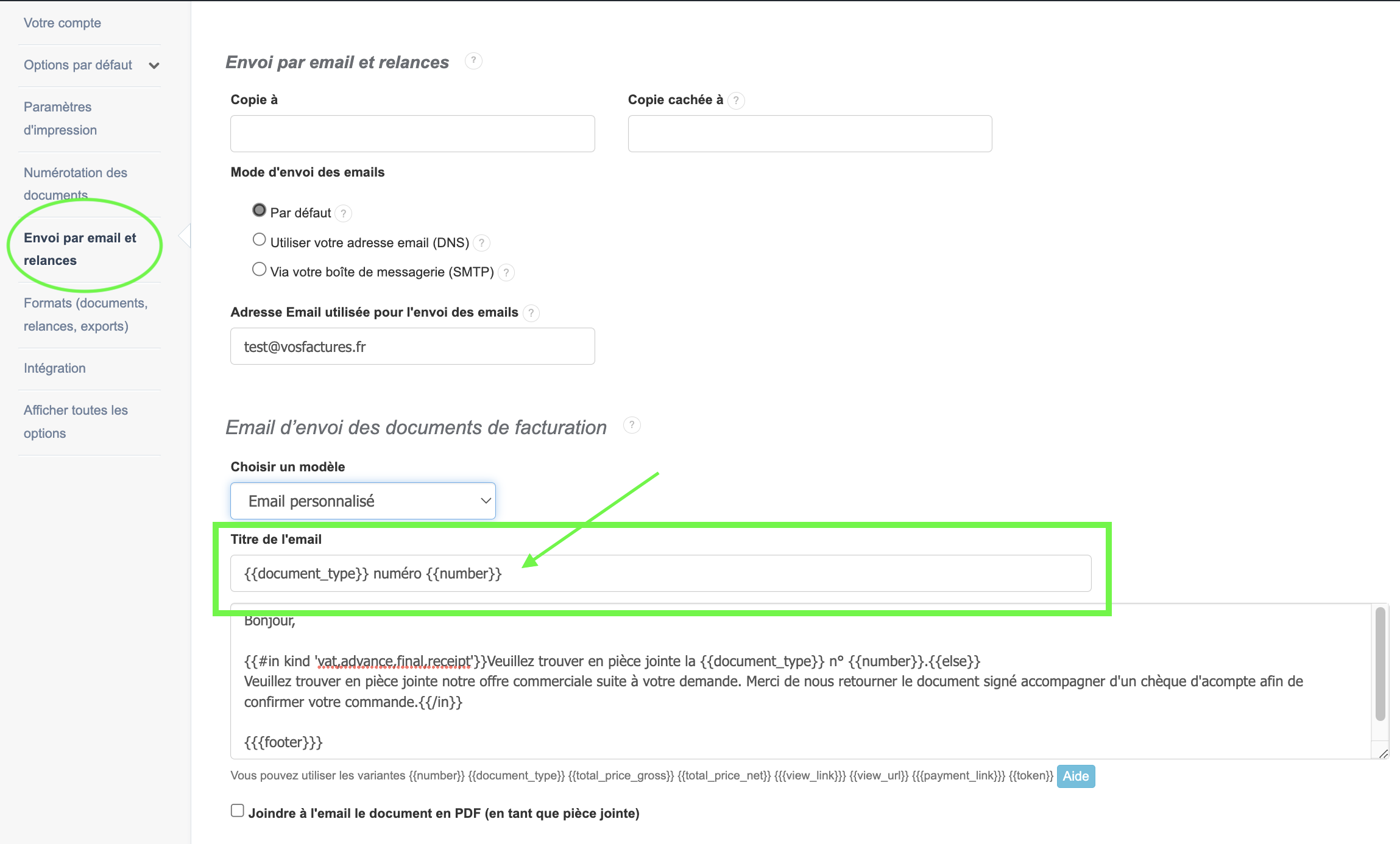 La logique pour personnaliser le champ "Titre" (accessible dans vos Paramètres du compte > Envoi par email) en fonction du type de document envoyé est exactement la même que pour le texte. N'oubliez pas de sauvegarder une fois le titre modifié.