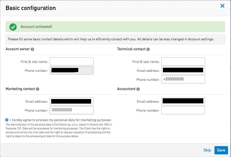 2) Remplissez les informations demandées, un code de vérification vous sera envoyé par SMS puis un email d'activation. 3) Connectez-vous ensuite à votre compte SMSAPI. Lors de la première connexion, une fenêtre vous demande de renseigner des informations.