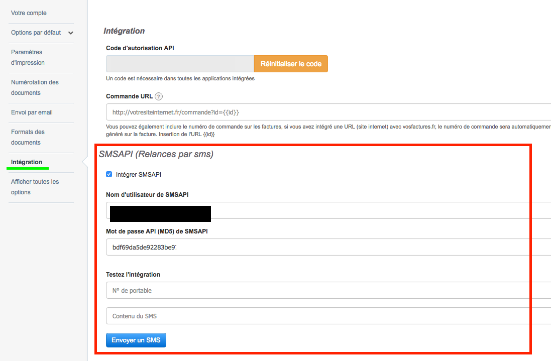 2) Depuis votre compte VosFactures, allez à Paramètres > Paramètres du compte > Intégration > SMSAPI et cochez la case "Intégrer SMSAPI". Renseignez le nom d'utilisateur et le mot de passe api (md5) de votre compte SMSAPI, puis sauvegardez. Vous pouvez envoyer un SMS test en entrant votre numéro de téléphone portable et un texte pour le SMS.