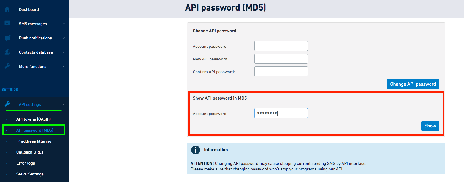 1) Une fois le compte SMSAPI créé, vous devez tout d'abord obtenir votre mot de passe API (md5) disponible dans votre compte SMSAPI. Pour cela, depuis votre tableau de bord SMSAPI dans la colonne de gauche, cliquez sur "API Settings" puis sur "API password (MD5)". Entrez votre mot de passe et cliquez sur "Show".
