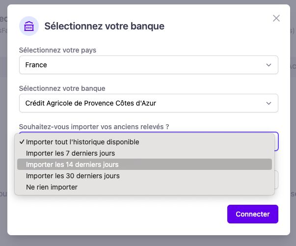 Vous pouvez créer une connexion avec la banque de votre choix et choisir de connecter un ou plusieurs comptes bancaires en suivant les étapes simples suivantes. Répétez la procédure pour établir une connexion avec une autre banque. Laissez-vous guider :