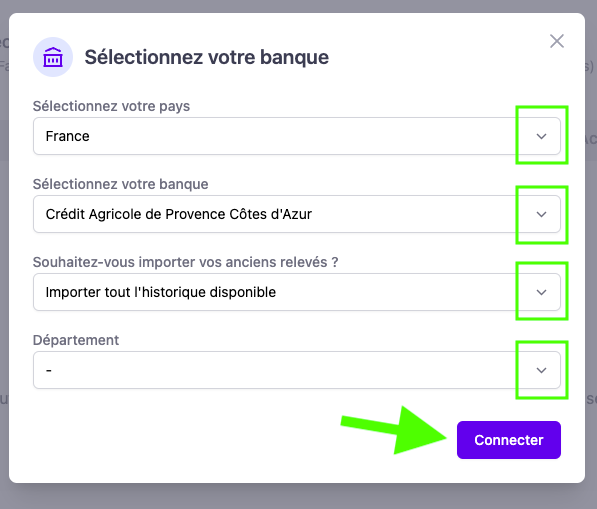 Pour cela, avant de cliquer sur "Connecter", choisissez dans les listes déroulantes :- le pays de la banque