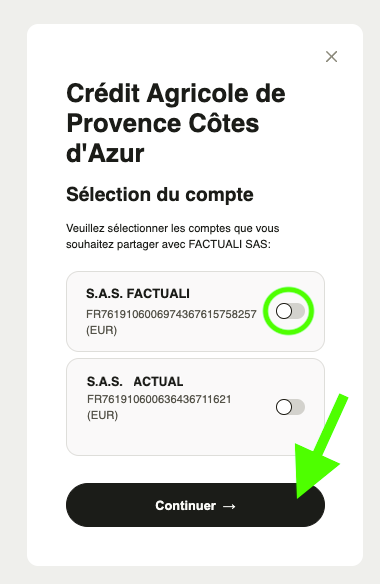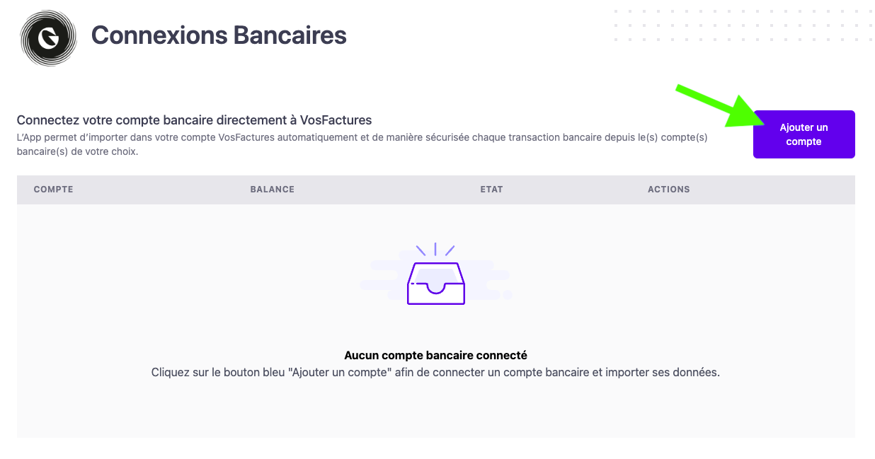 Vous êtes alors invité à connecter un compte bancaire comme expliqué ci-dessous.