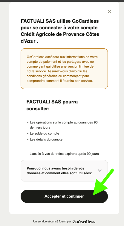 afin de confirmer que vous acceptez l'intégration avec GoCardless. -