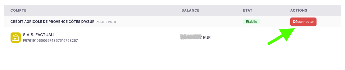 Vous pouvez à tout moment mettre fin à une connexion bancaire. Pour cela, retournez dans Paramètres > Apps & Modules > Imports bancaires > Connexions Bancaires > bouton Configurer , et cliquez sur le bouton rouge "Déconnecter" sur la ligne de la connexion à désactiver. Confirmez votre choix. Cela mettra immédiatement fin à la synchronisation bancaire du ou des comptes bancaires inclus dans la connexion désactivée. Bien sûr, les lignes de paiements précédemment importées seront conservées dans votre onglet Paiements.