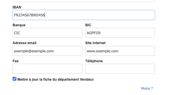 - cliquez sur Plus pour renseigner les coordonnées bancaires