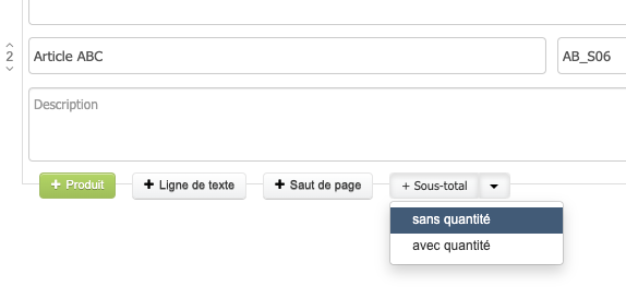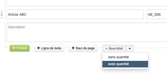 En particulier vous pouvez y ajouter une ou plusieurs lignes de sous-total, avec ou sans la quantité, pour mettre en évidence le total dû pour un groupe de produits & services. Par exemple, pour distinguer dans un devis de BTP le sous-total "Matériel" du sous-total "Main d'oeuvre".