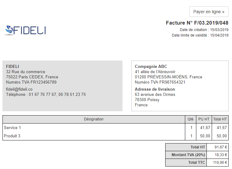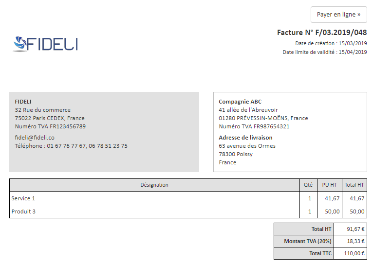 Facture au format Classique, avec police par défaut :
