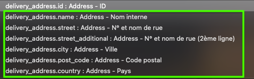 - Les champs de l'adresse de livraison de l'acheteur (correspondent aux titres commençant par "delivery_address." comme par exemple "delivery_address.city").